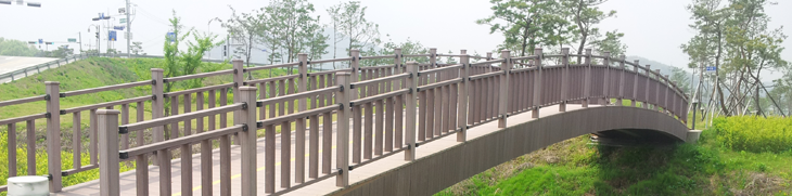 하천 횡단부나 도로법면부에 공장에서 제작된 변단 면겨더, 주거더, 가로보, 각형강관, 합성목재, 난간을